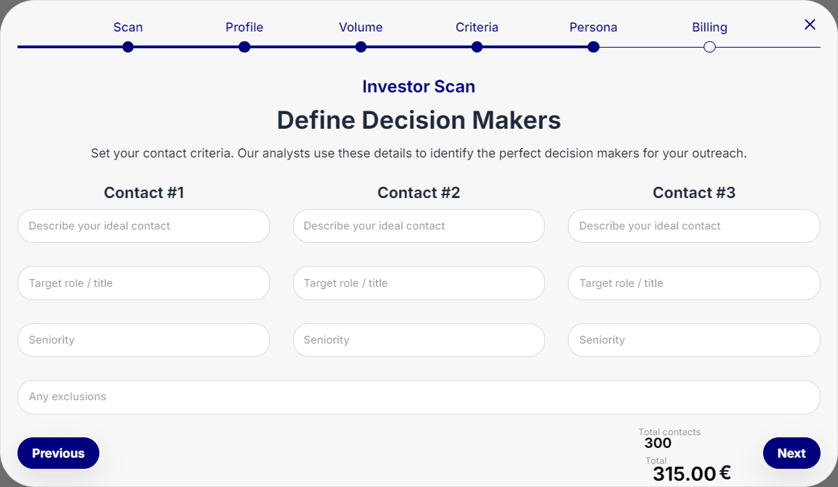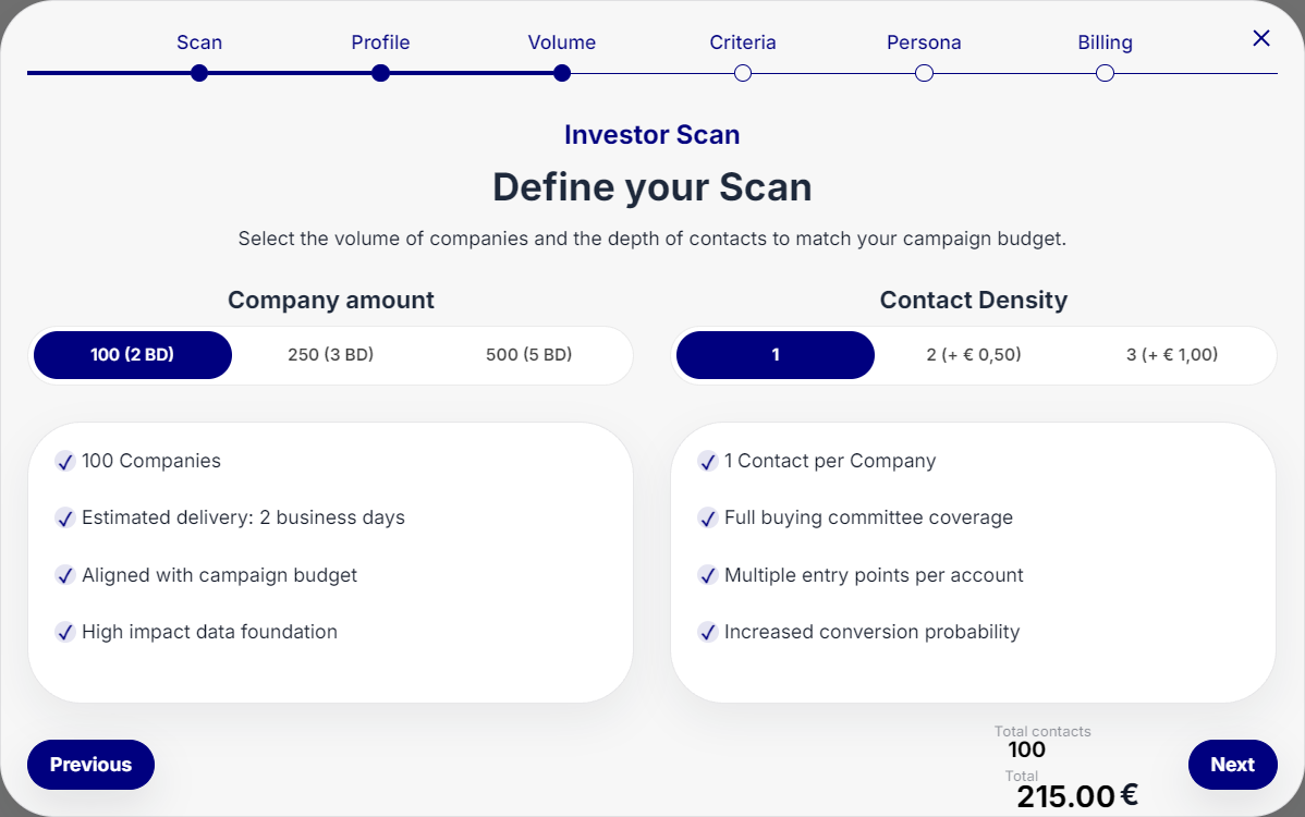 The process begins with your vision. Using our guided configurator, you define scan type, volume, and specific targeting criteria. You set the precise parameters that form the basis of our research.
